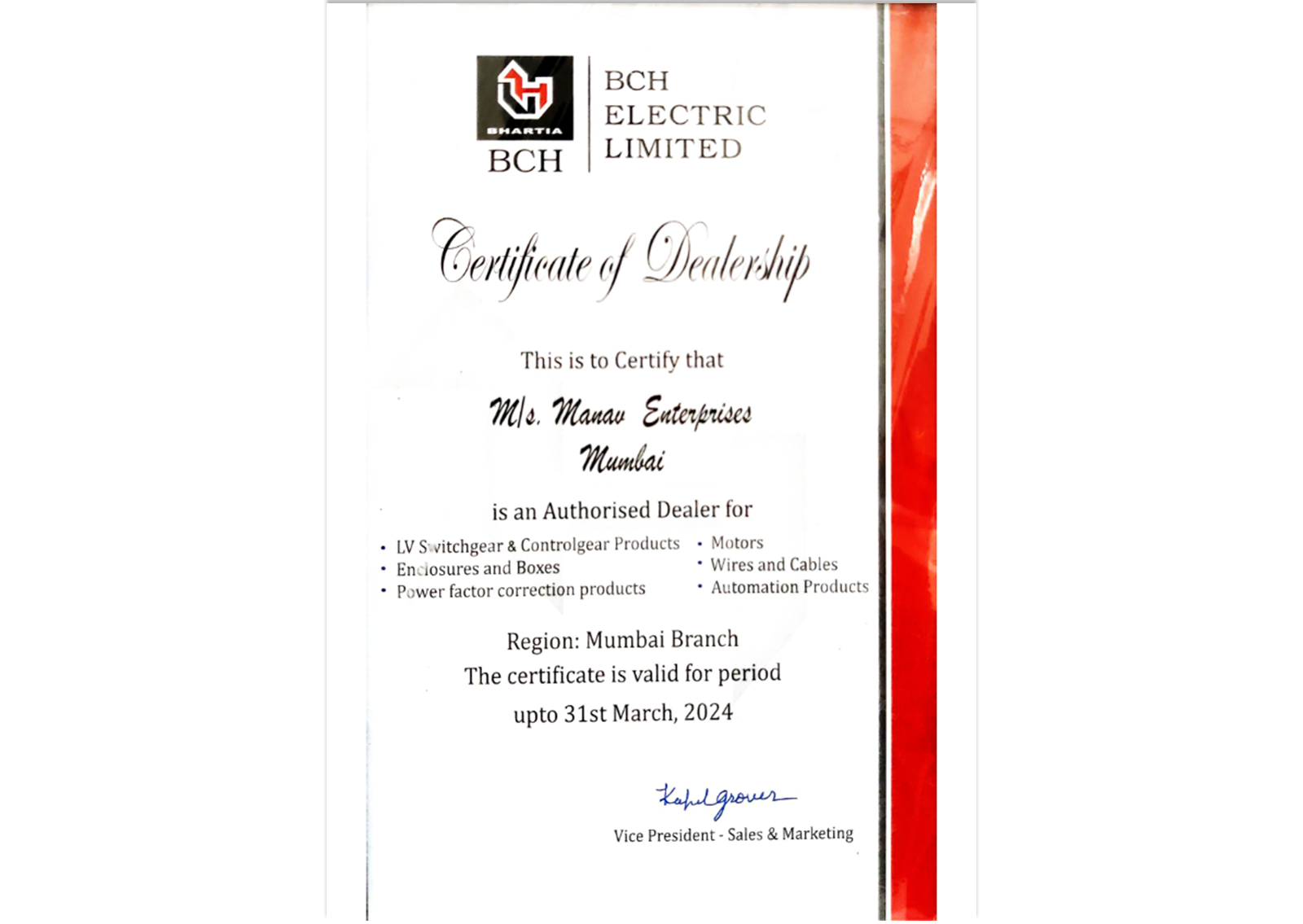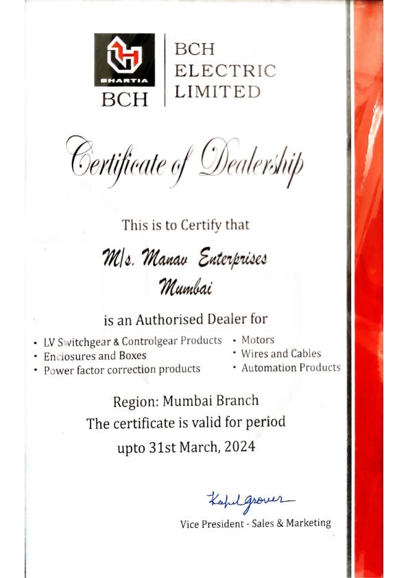 Established in the year 1996, We Manav Enterprises, are one of the leading authorized Dealers & Stockists of BCH ELECTRIC LIMITED. (Previously known as Bhartiya Cutler Hammer Limited) who are leading manufacturers of Contactors, Relays, Limit Switches, Plugs & Sockets, Brakes, Pneumatic & Electronic Timer, Foot Switches and also various Agricultural related Electrical items. In addition to that we also deal in all major industrial items of major brands such as Siemens, L&T, Schneider, Comet, Polycab, Pla, Elmex, Connectwell, Teknic, etc.